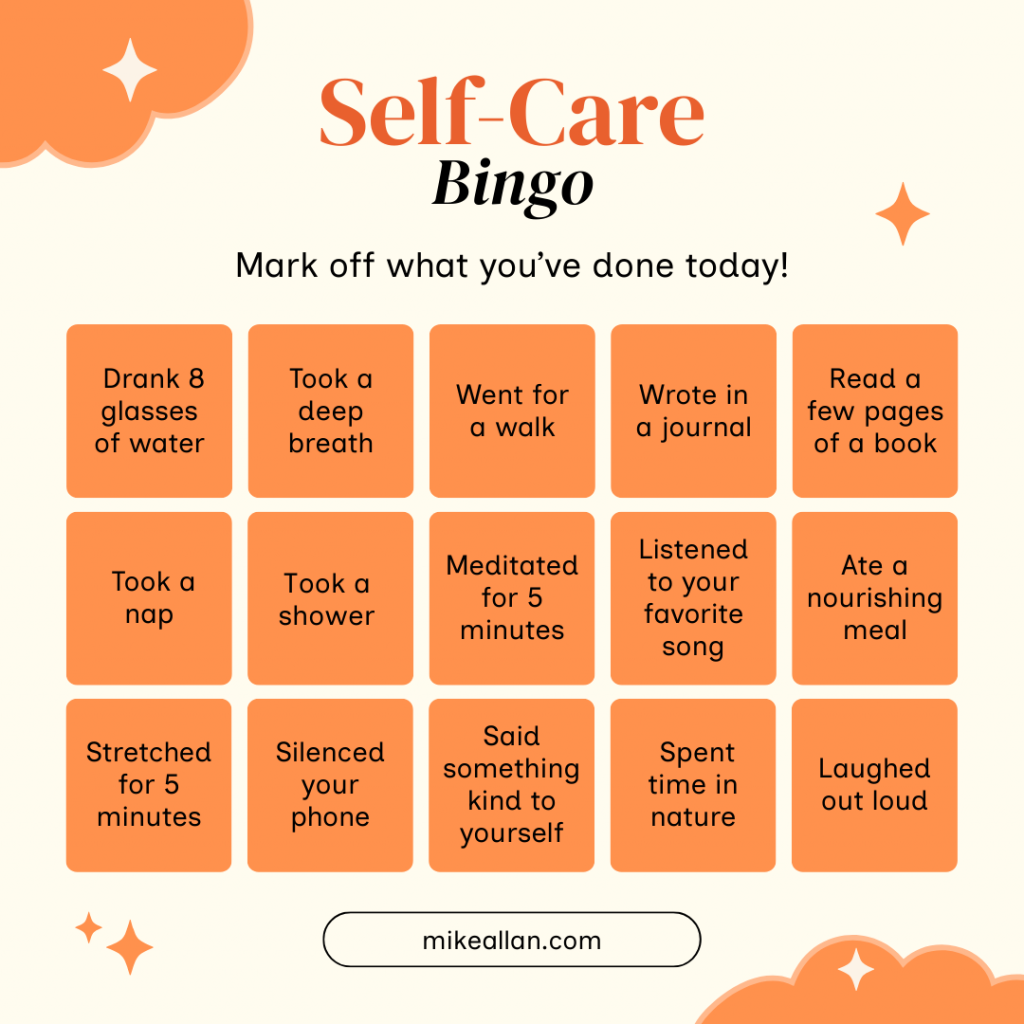 I send a Self-Care Bingo card to all my peer support group participants at the start of our sessions.