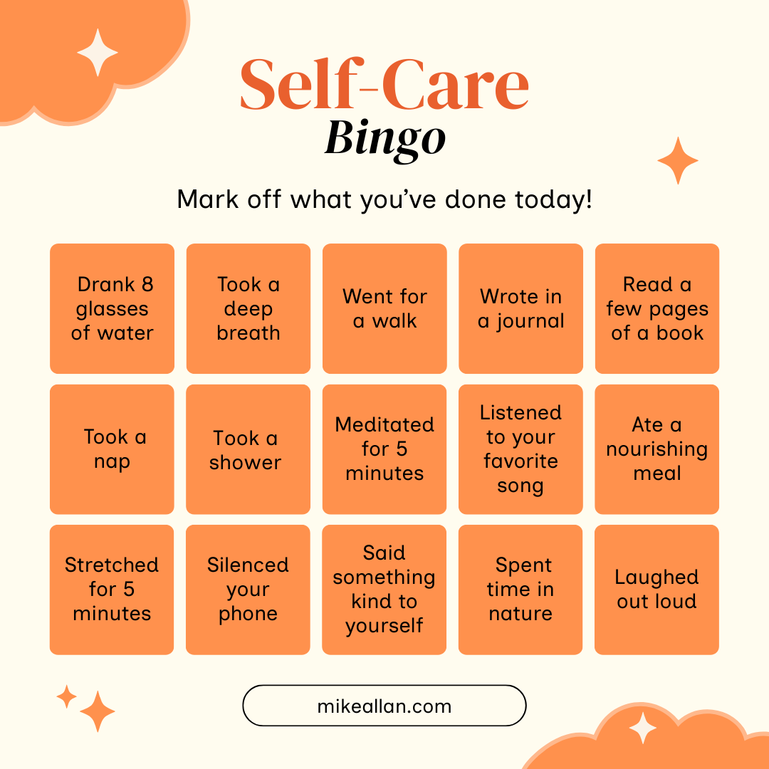 I send a Self-Care Bingo card to all my peer support group participants at the start of our sessions.